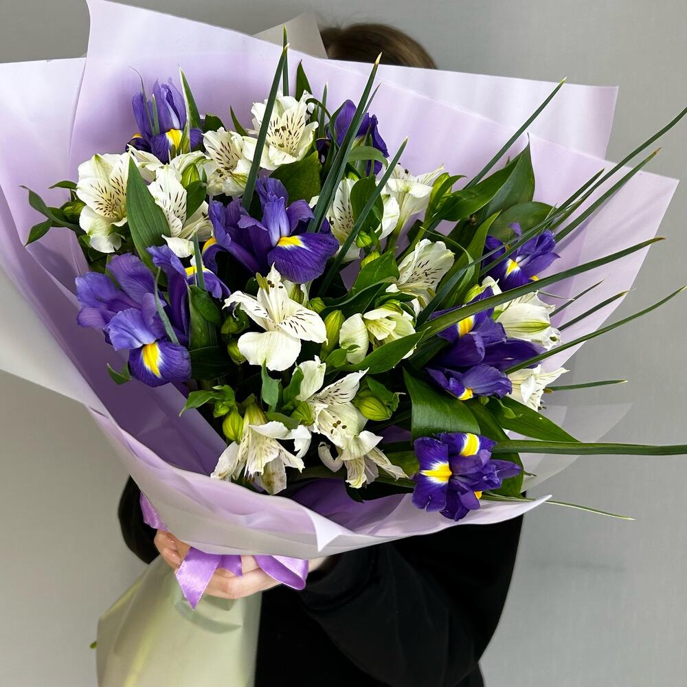 Альстромерия – 6 шт.Ирис – 7 шт.Зелень – 2 шт.Упаковка дизайнерская – 2 шт.Лента атласная – 2 шт.