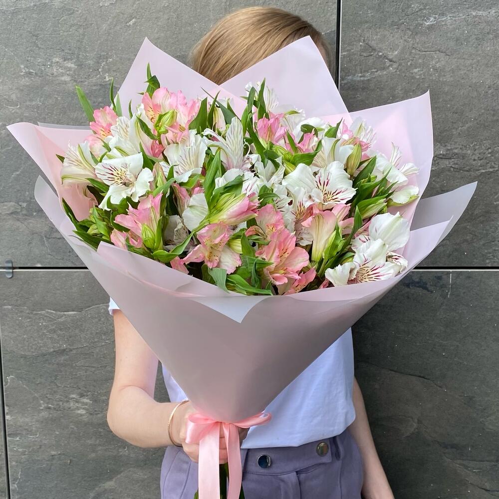 Лента атласная – 1 шт.Альстромерия белая – 7 шт.Альстромерия розовая – 8 шт.Дизайнерская упаковка – 3 шт.