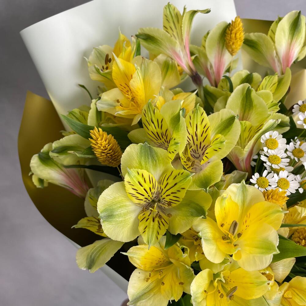 Альстромерия – 7 шт.Матрикария – 2 шт.Фаларис – 10 шт.Упаковка дизайнерская – 1 шт.