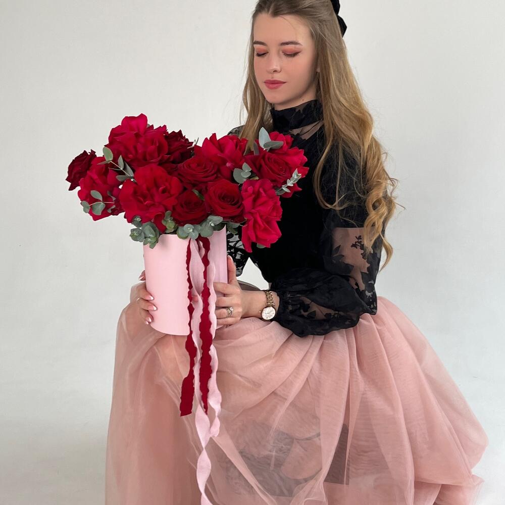 розы французские готча – 7 шт.розы красные red naomi – 10 шт.Эвкалипт цинерея – 5 шт.Коробка шляпная – 1 шт.