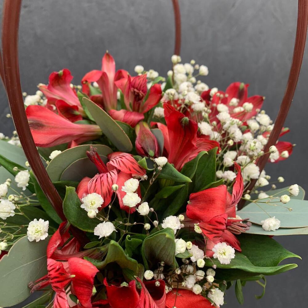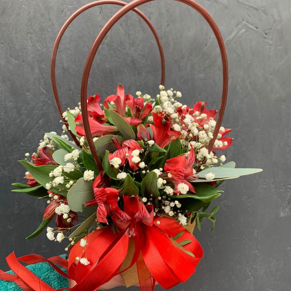 Альстромерия – 5 шт.Гипсофила – 2 шт.Фисташка – 5 шт.Эвкалипт – 5 шт.Сумочка картонная – 1 шт.Оазис флористический – 1 шт.Лента атласная – 3 шт.
