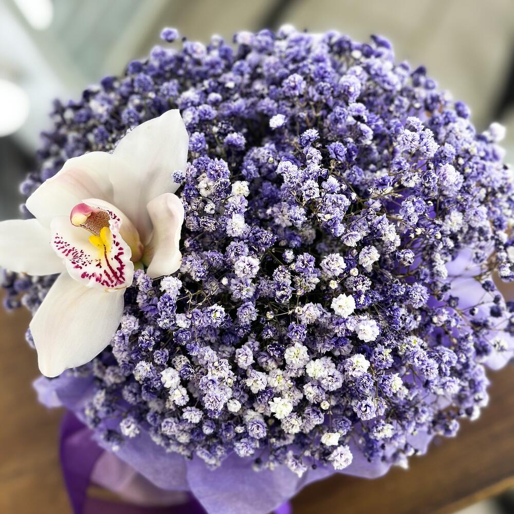 Играющая, сиреневая гипсофила с долгоиграющей Орхидеей собрана в одну стильную шляпную коробку!Благодаря пышности этих цветов,букет смотрится словно воздушный закат уходящий вдаль!Яркий и необычный комплимент для любого повода!Добавляйте товар и магазин в избранное,чтобы было легче нас найти