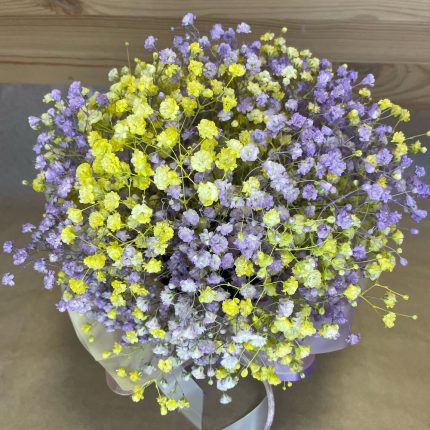 “Сиреневый туман” – композиция из гипсофилы в шляпной коробке