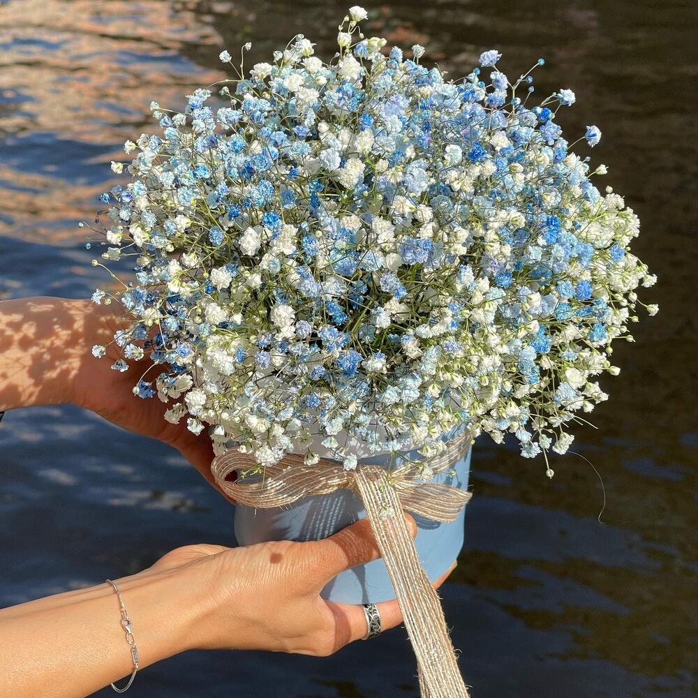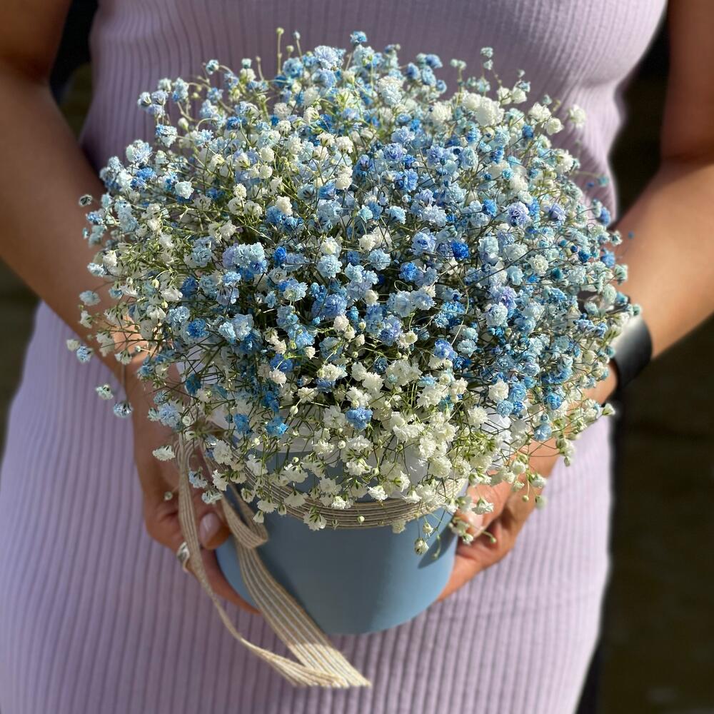 “Сиреневый туман” – композиция из гипсофилы в шляпной коробке