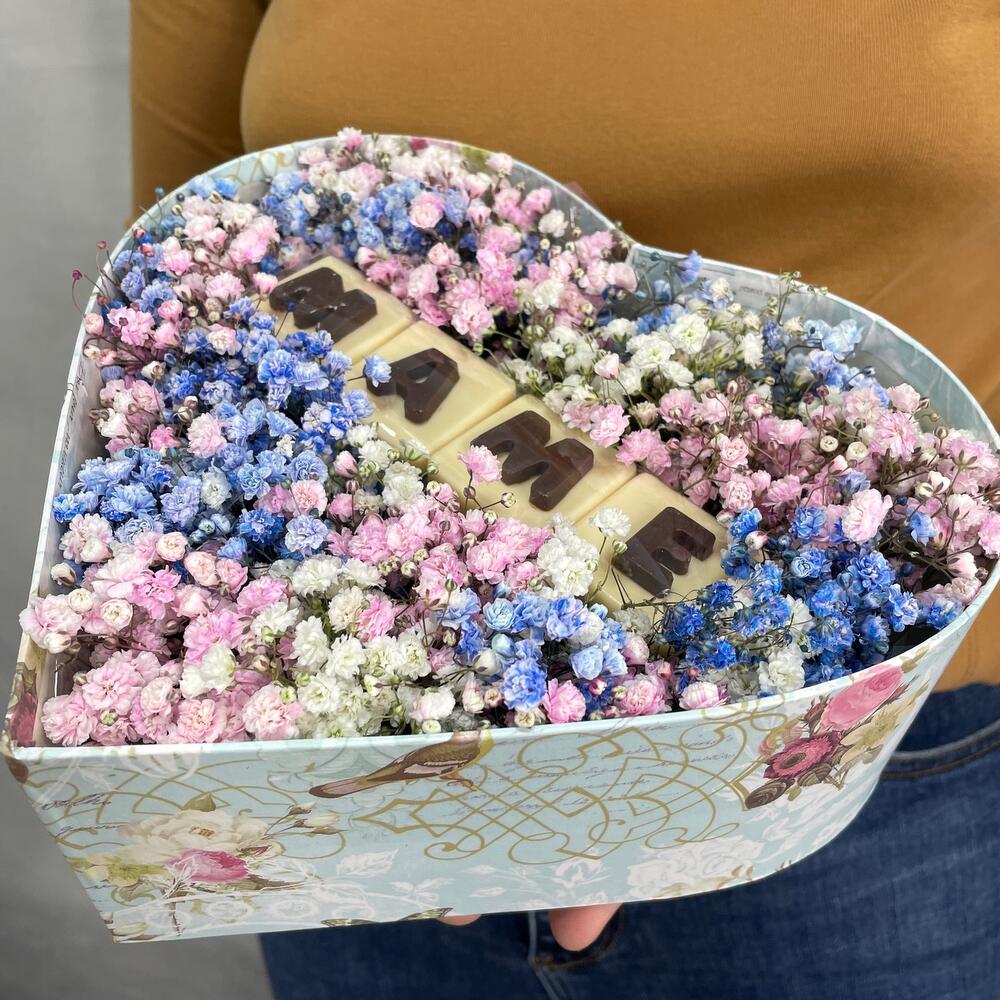 Коробка сердце – 1 шт.Оазис – 1 шт.Шоколадная буква – 4 шт.гипсофила цветная – 5 шт.