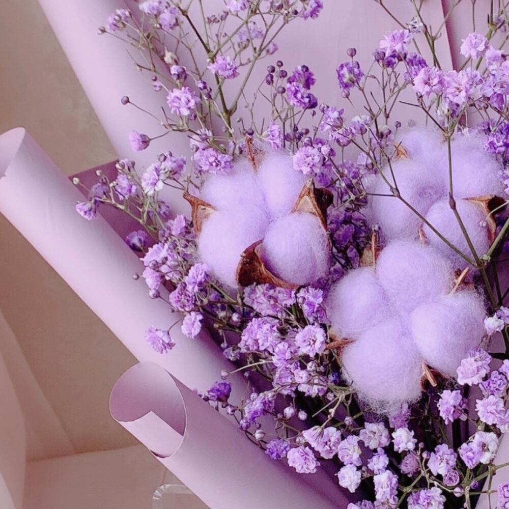 Хлопок – 3 шт.Лента атласная – 1 шт.Гипсофила фиолетовая – 1 шт.Дизайнерская упаковка – 1 шт.