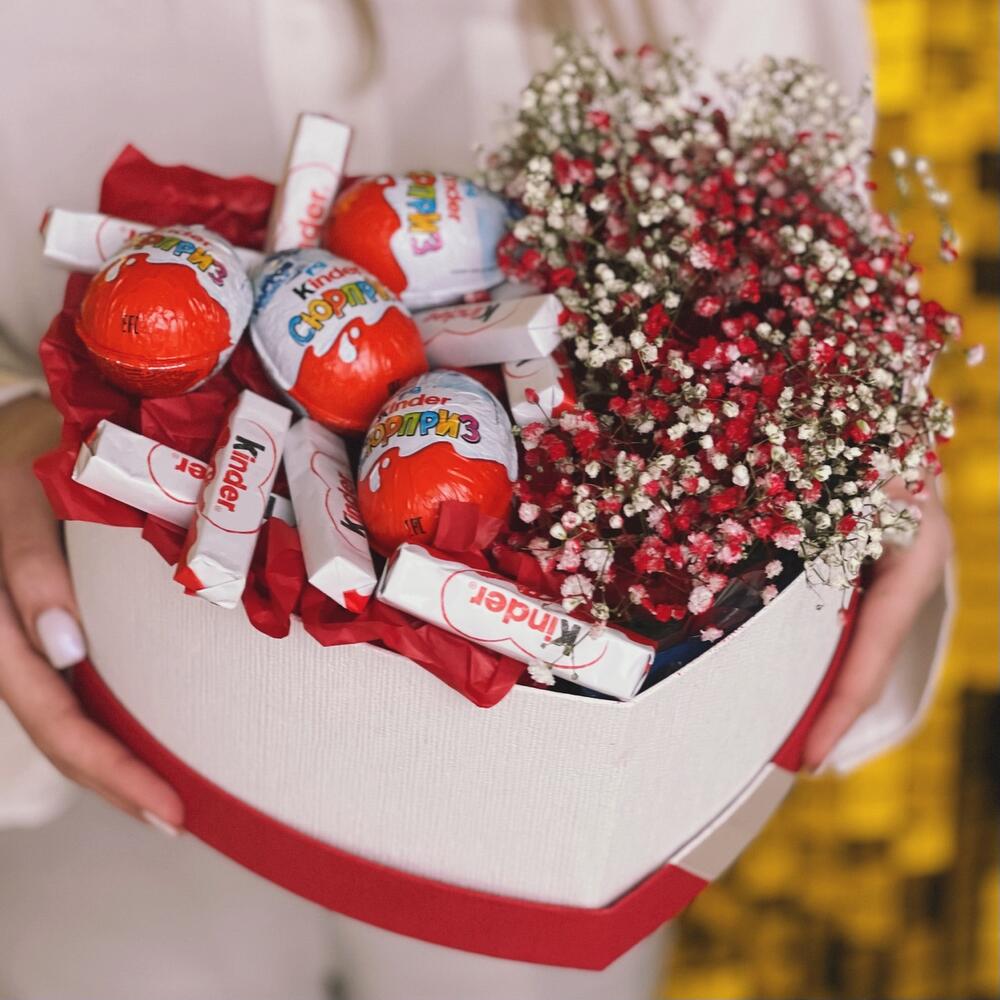 Гипсофила – 5 шт.Шляпная коробка – 1 шт.Киндер шоколад – 10 шт.Киндер сюрприз яйцо – 4 шт.