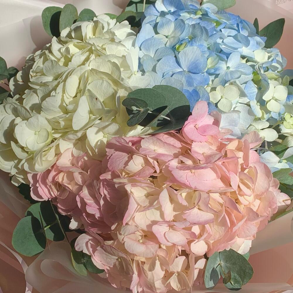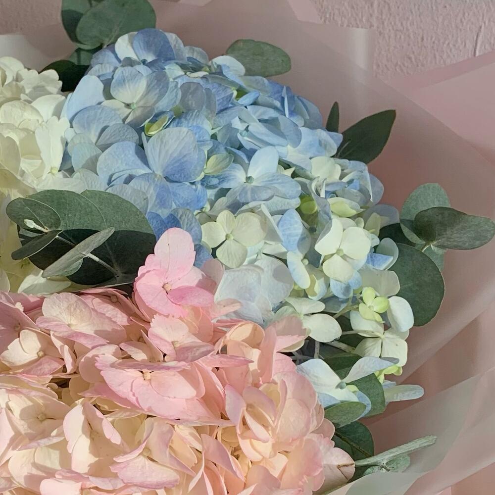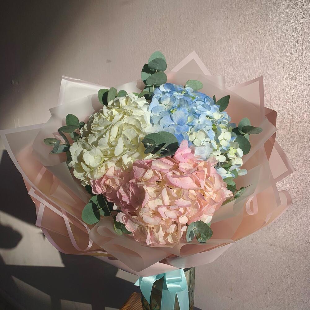 Гортензия – 3 шт.Эвкалипт – 5 шт.Лента атласная – 1 шт.Упаковка дизайнерская – 2 шт.