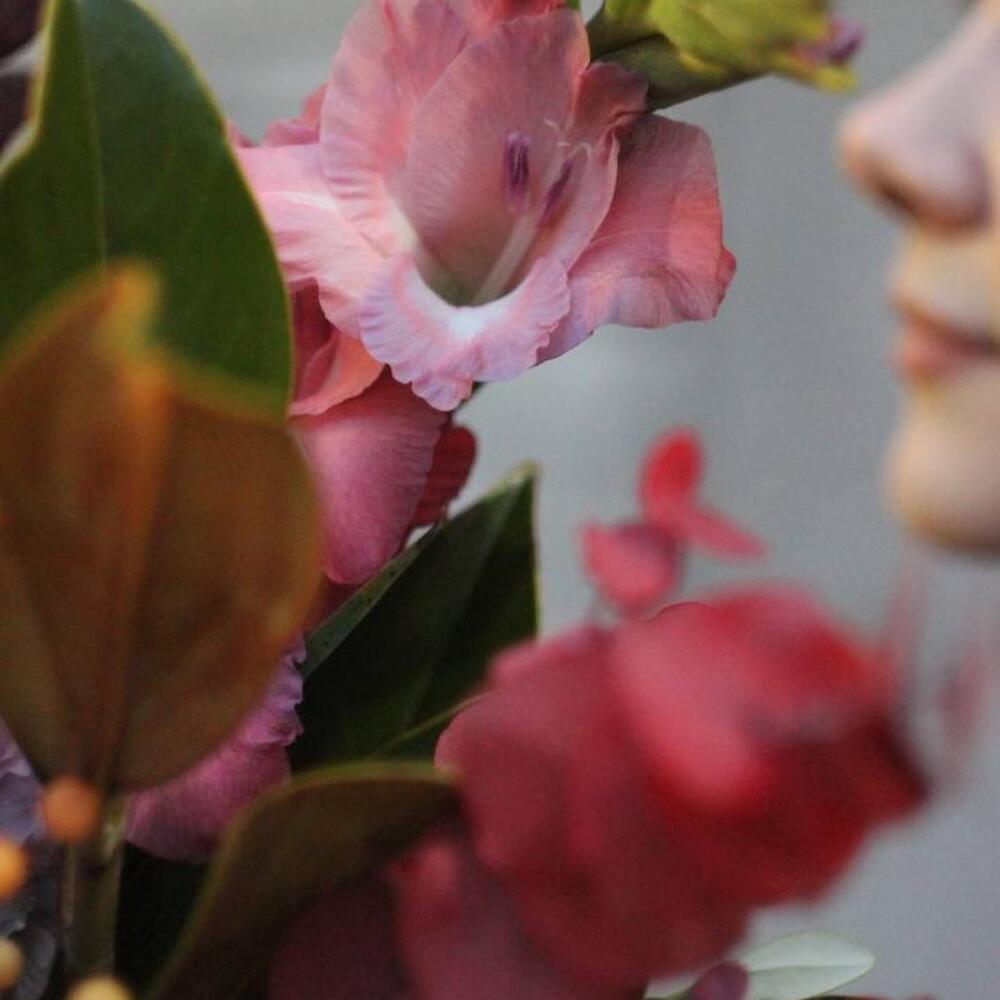 Протея – 1 шт.Гладиолус – 1 шт.илекс ветка – 2 шт.Гортензия – 1 шт.Маттиола – 3 шт.Котинус – 3 шт.листья магнолии ветка – 1 шт.эвкалипт стабилизируемый – 2 шт.Питтоспорум – 2 шт.Лента – 1 шт.
