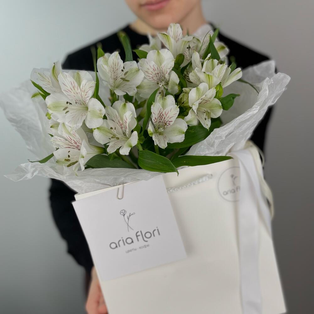 Альстромерия – 5 шт.Тишью – 2 шт.Лента кружевная – 1 шт.подкормка для срезанных цветов – 1 шт.инструкция по уходу за цветами – 1 шт.любовь флориста – 1 шт.записка с вашим текстом – 1 шт.сумка пакет для цветов – 1 шт.шоколадный медиант ручной работы – 1 шт.