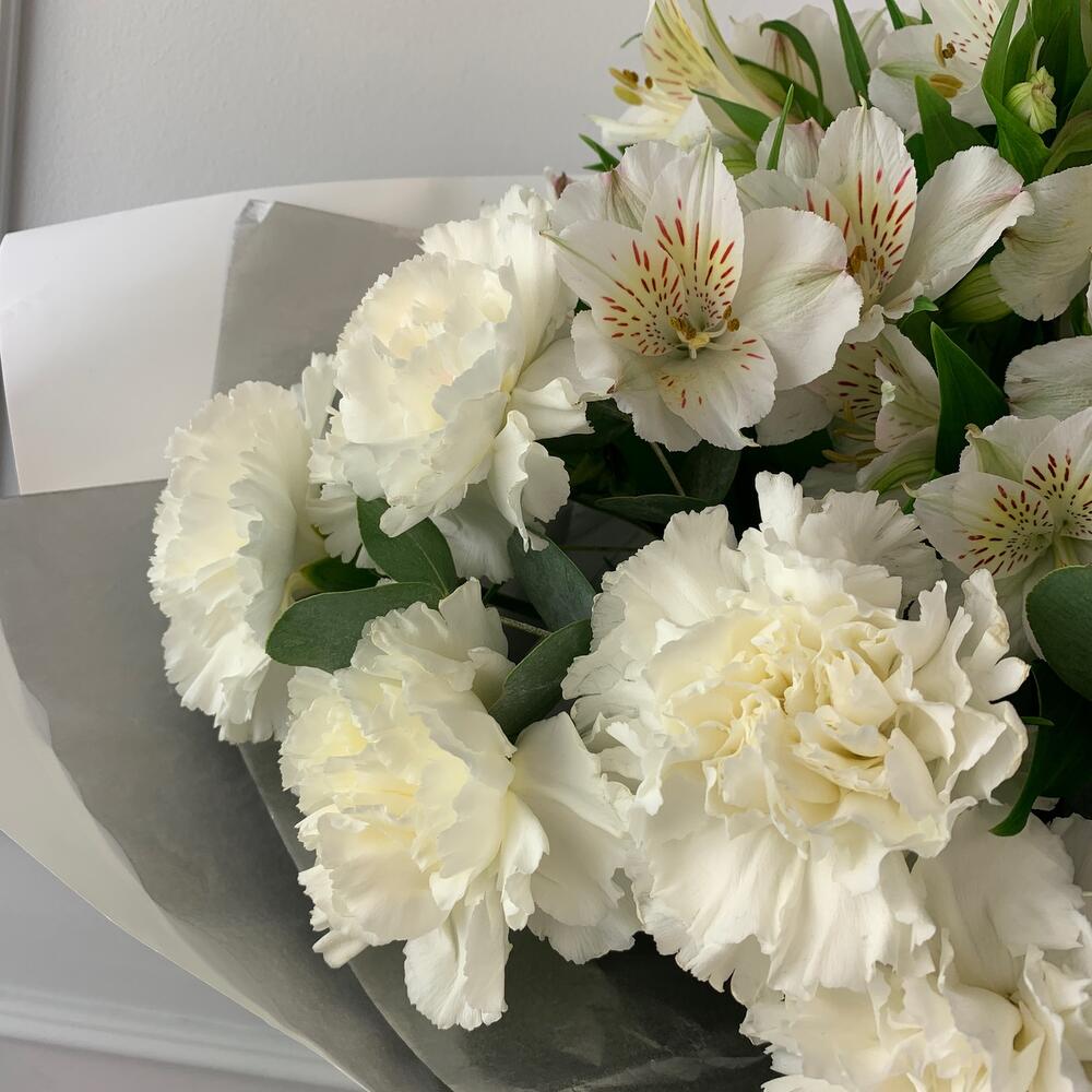 Гвоздика одноголовая – 5 шт.Альстромерия – 6 шт.Эвкалипт – 2 шт.Тишью – 1 шт.Пленка дизайнерская – 1 шт.Лента атласная – 1 шт.