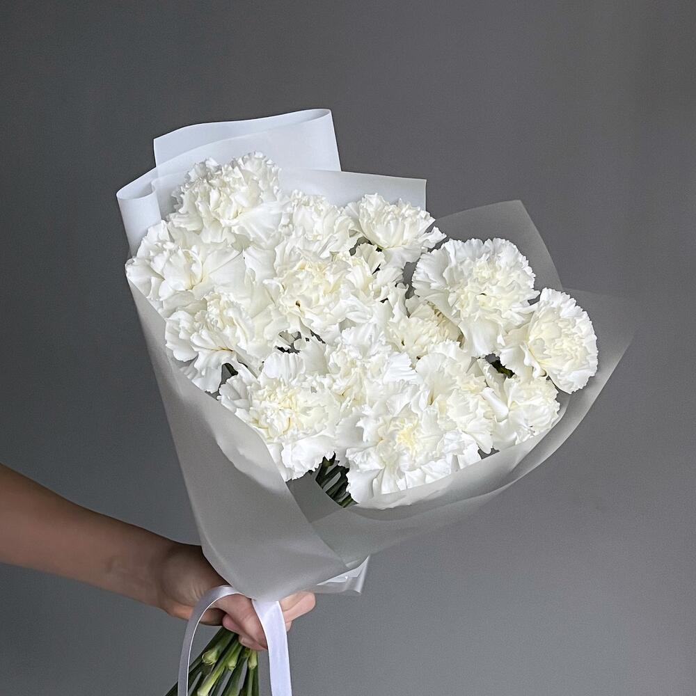 Гвоздика белая – 15 шт.Дизайнерская упаковка – 1 шт.Лента – 1 шт.