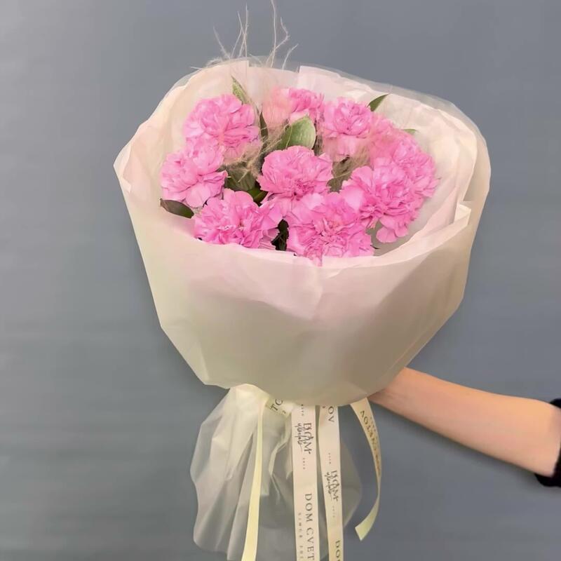 Гвоздика – 9 шт.стифа пучок – 2 шт.Рускус – 5 шт.флористическая краска – 1 шт.Тишью белое – 1 шт.пленка матовая прозрачная – 1 шт.Лента репсовая – 1 шт.