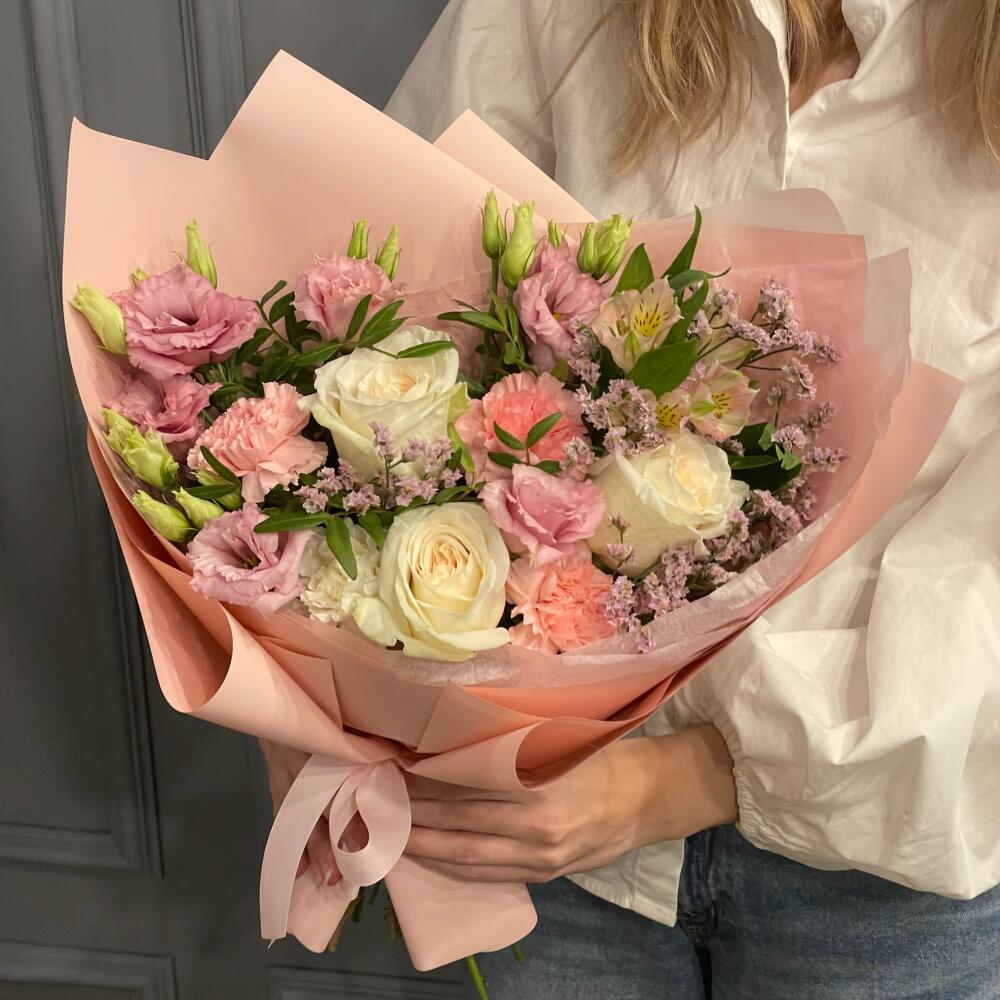 Категории: АльстромерииРозы, Гвоздики, Лизиантусы