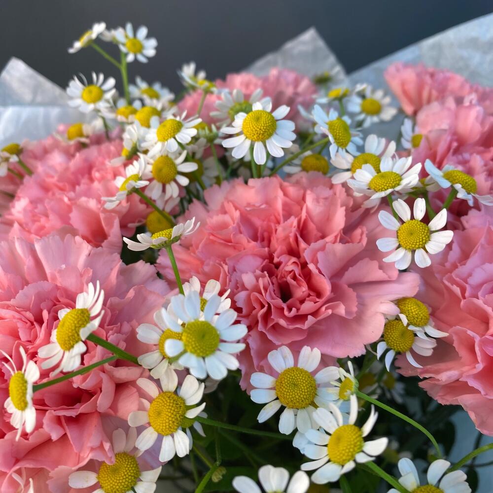 гвоздика розовая диантус – 9 шт.ромашка кустовая танацетум – 3 шт.зелень декоративная ветка – 1 шт.Упаковка дизайнерская – 5 шт.