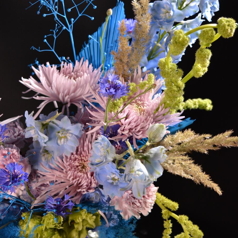 Хризантема – 5 шт.Гвоздика – 7 шт.Дельфиниум – 5 шт.василек – 7 шт.Злаки – 3 шт.Сухоцветы – 10 шт.Амарант – 3 шт.