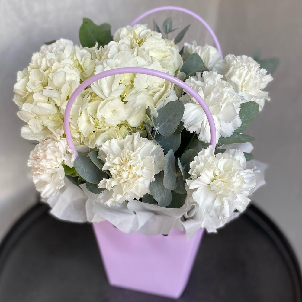 Гортензия – 1 шт.Эвкалипт – 5 шт.Сумка картон – 4 шт.Тишью – 1 шт.Диантус белый – 8 шт.Оазис флористический – 1 шт.