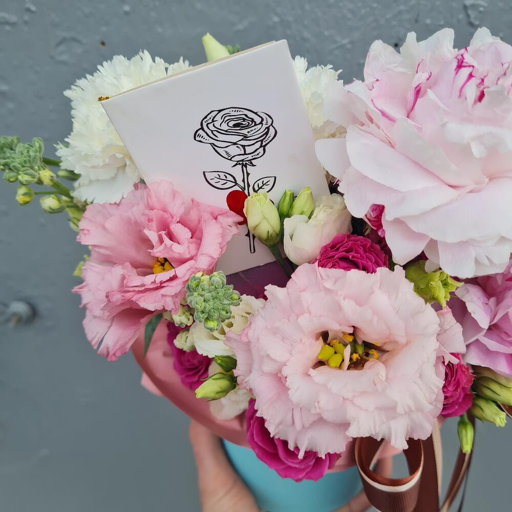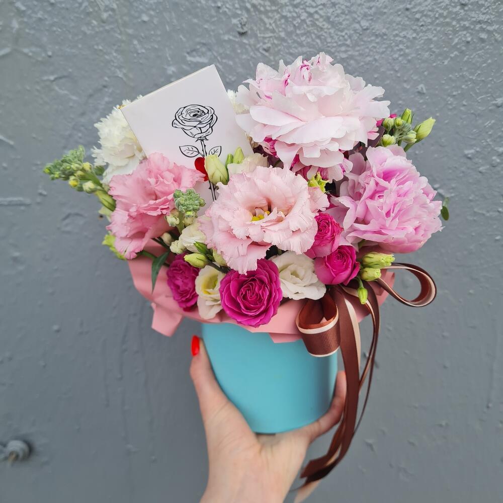 Комплимент из пионовидных роз, пионов, эустомы в ящике