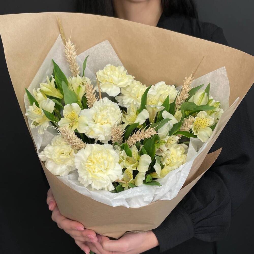 Альстромерия – 7 шт.Тишью – 4 шт.Диантус – 7 шт.Колосья – 15 шт.Крафт дизайнерский – 4 шт.