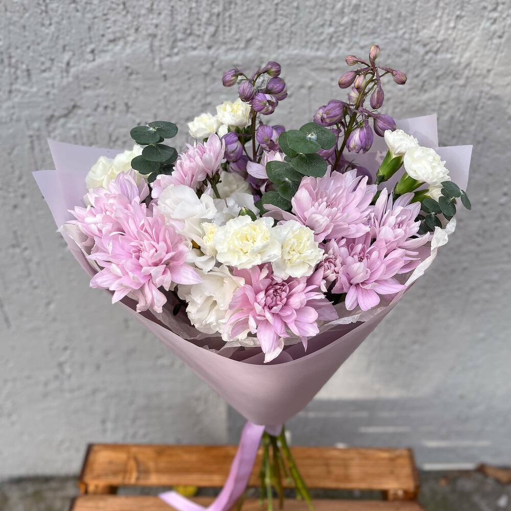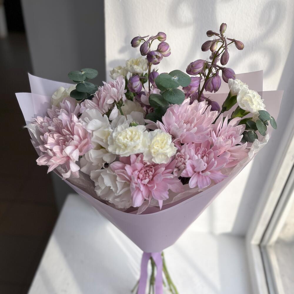 Альстромерии, Гвоздики, Кустовые розы, Лизиантусы, Розы, Хризантемы