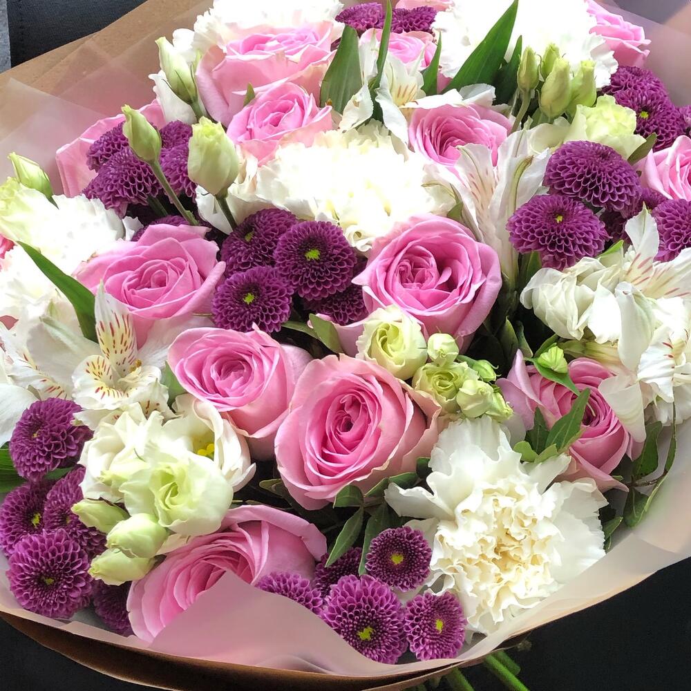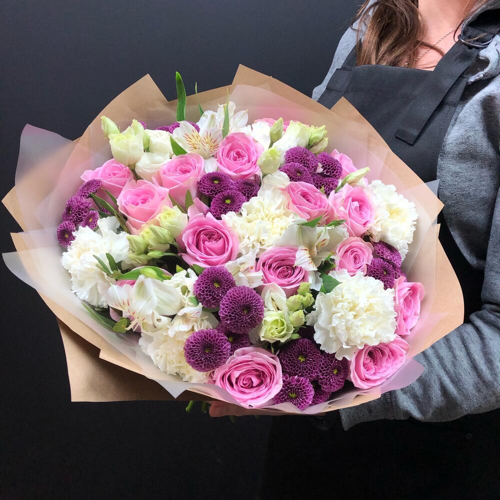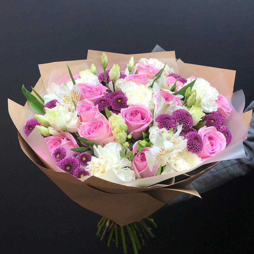 Альстромерии, Гвоздики, Кустовые розы, Лизиантусы, Розы, Хризантемы