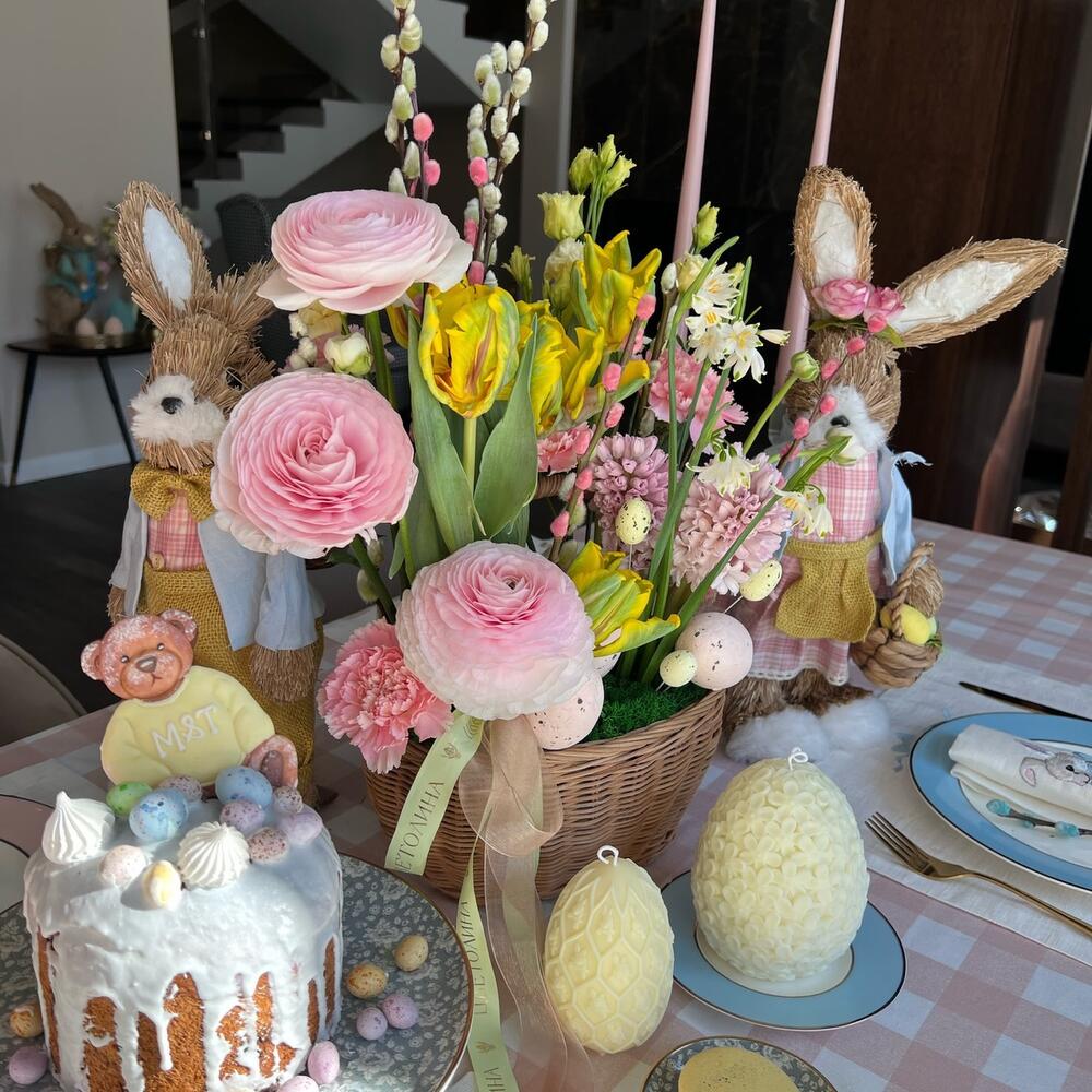 Верба – 6 шт.Лизиантус – 2 шт.Тюльпан – 5 шт.Гвоздика – 7 шт.Ранункулюс – 2 шт.Корзина плетеная – 1 шт.Мох натуральный – 1 шт.Оазис флористический – 1 шт.