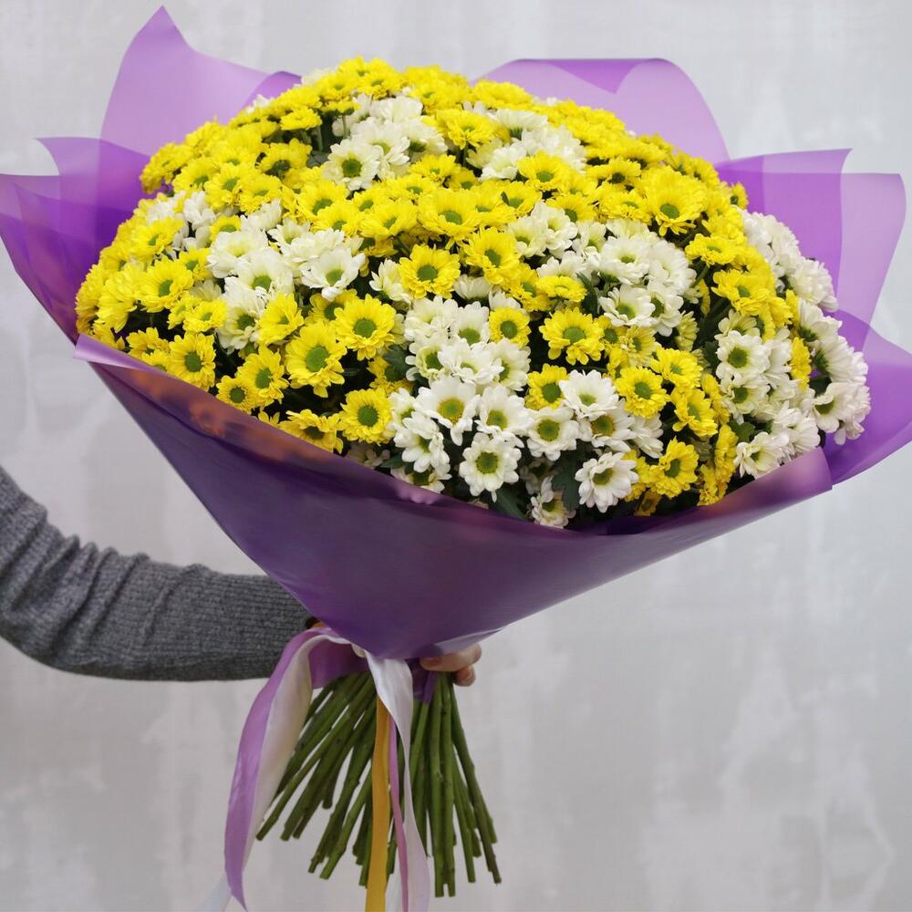 Букет из 49 кустовых хризантем Сантини микс в стильной упаковке