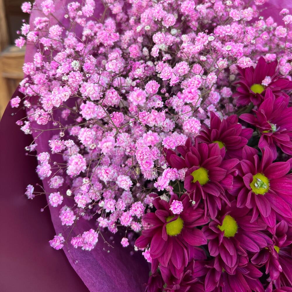 Гипсофила – 6 шт.Хризантема кустовая ромашковая – 5 шт.Тишью – 2 шт.дизанерская упаковка – 5 шт.Лента атласная – 2 шт.