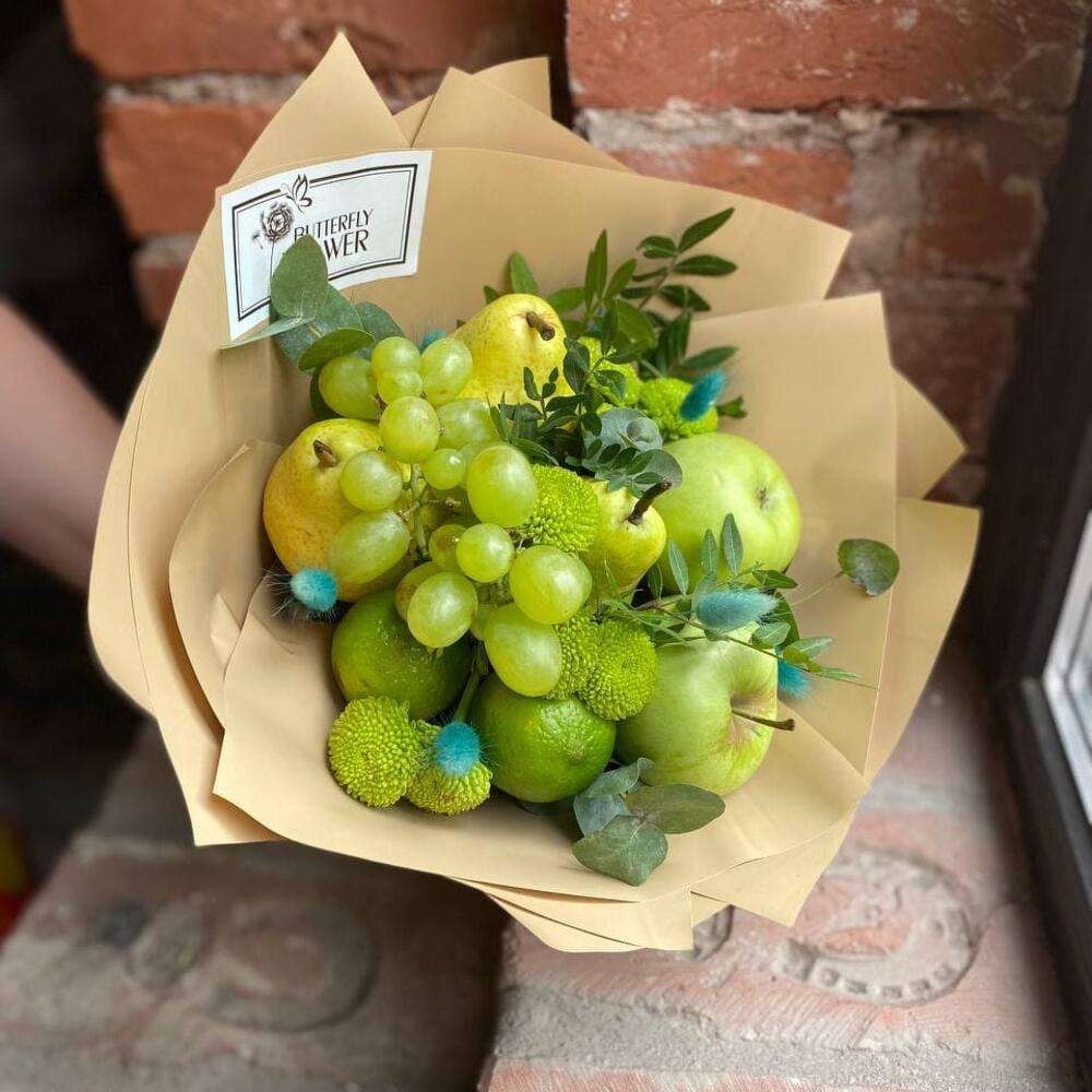 Эвкалипт – 2 шт.Лента атласная – 1 шт.Яблоко – 2 шт.Крафт – 1 шт.Груша – 3 шт.Лагурус – 8 шт.Хризантема кустовая Филин Грин – 2 шт.Виноград гроздь – 1 шт.