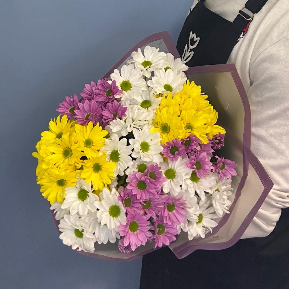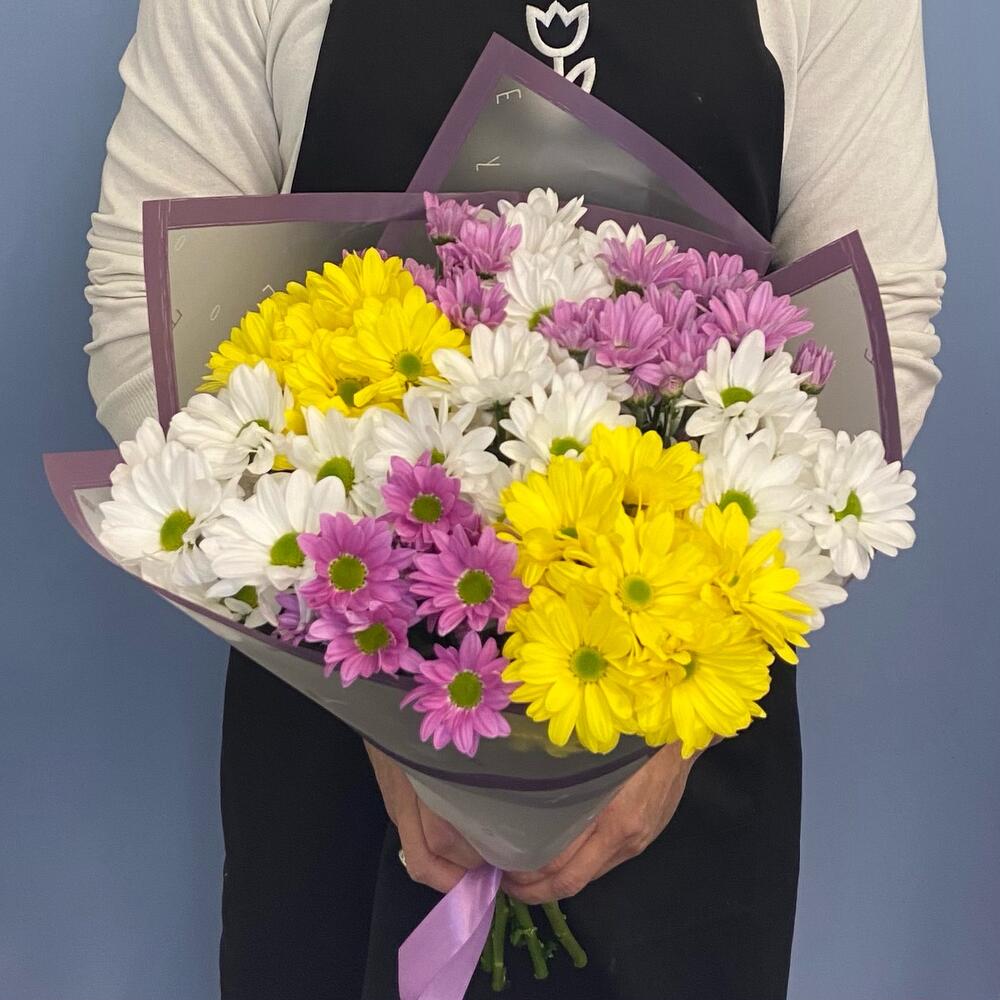 Кустовая хризантема – 9 шт.Упаковка дизайнерская – 1 шт.Лента атласная – 1 шт.