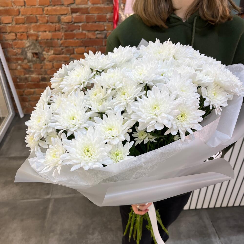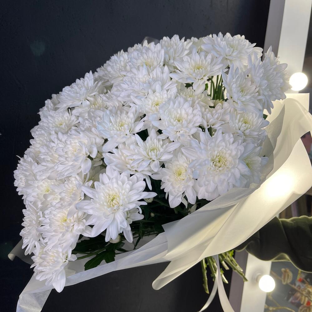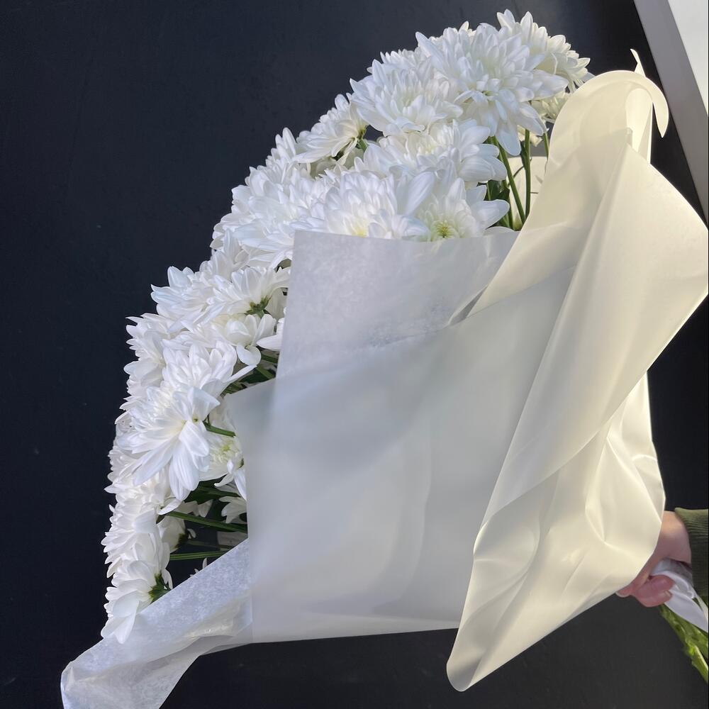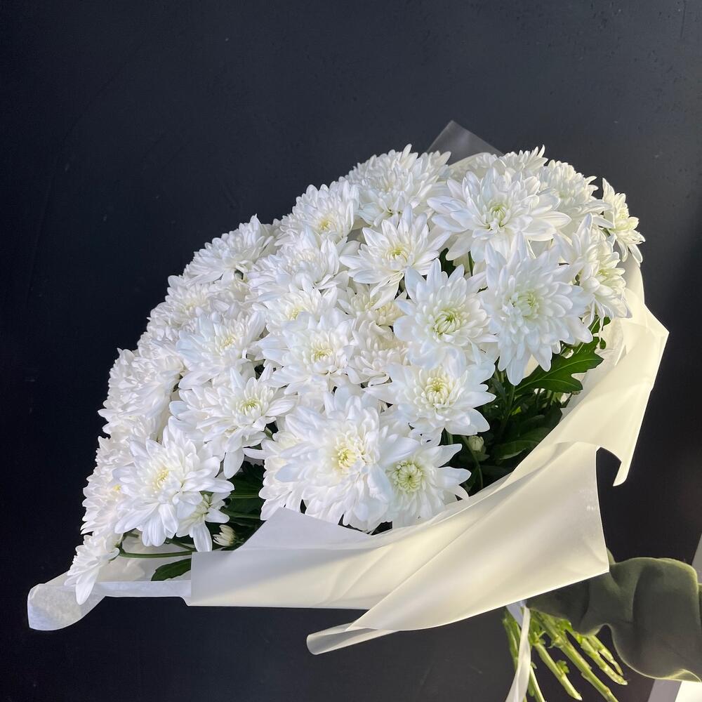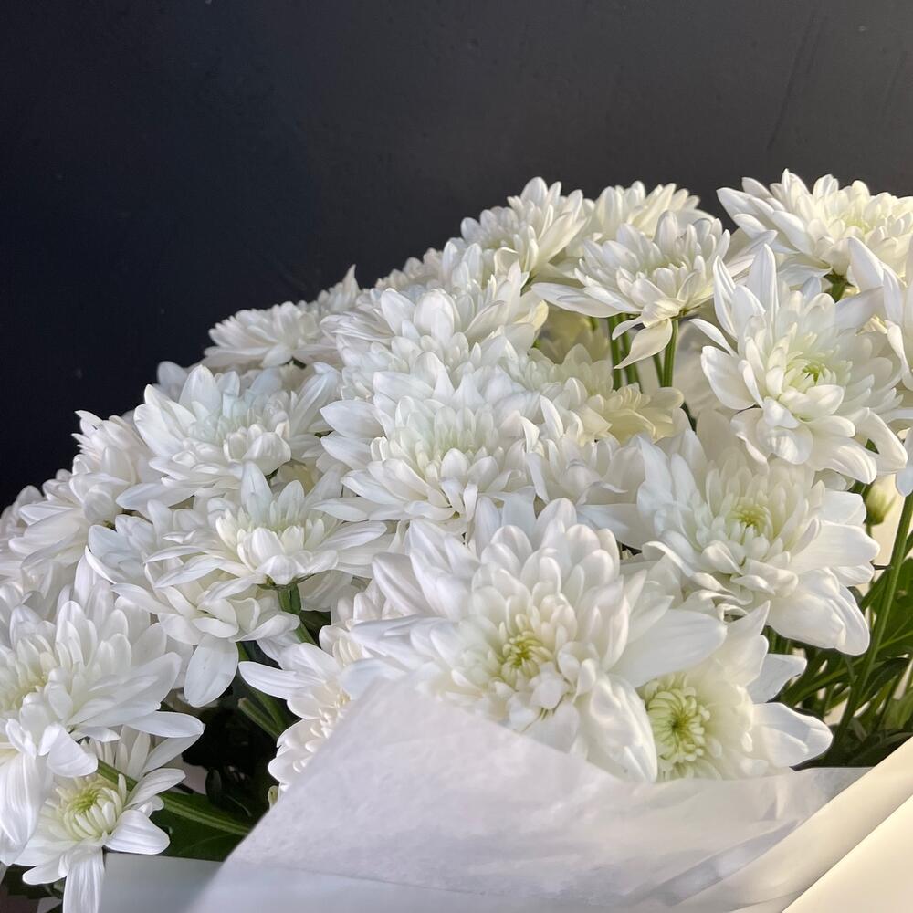 Открыточка с вашими пожеланиями – 1 шт.Хризантема кустовая зембла белая – 9 шт.Упаковка матовая – 1 шт.