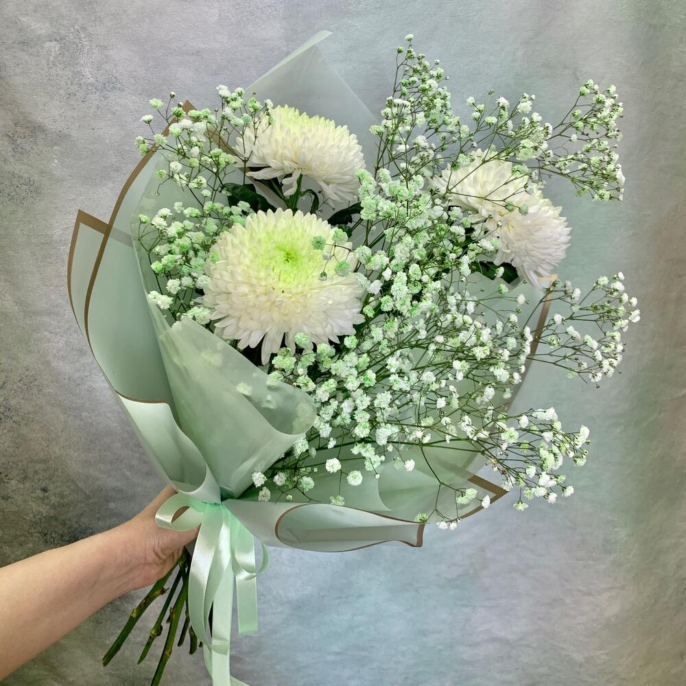 Хризантема магнум – 3 шт.Гипсофила – 3 шт.Рускус – 2 шт.Упаковка дизайнерская – 2 шт.