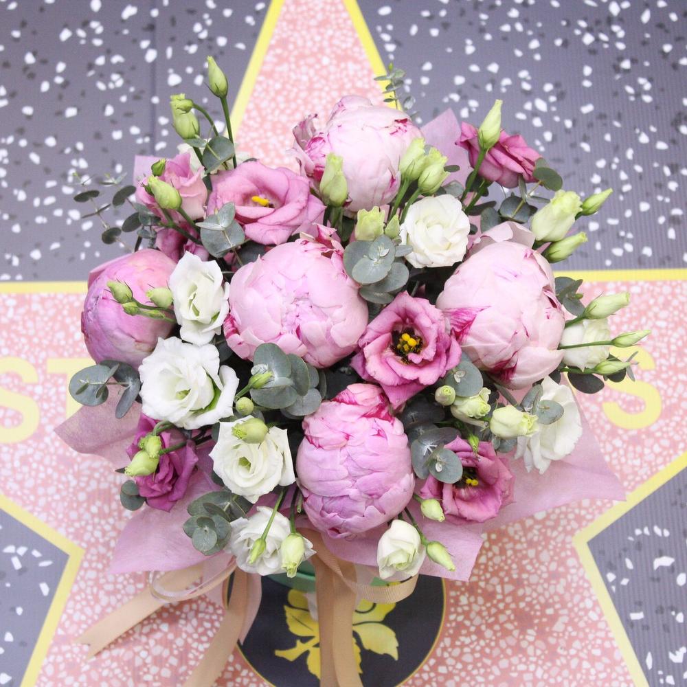 Пион Сара Бернар – 5 шт.эустома микс – 5 шт.Эвкалипт – 3 шт.Оазис флористический – 1 шт.Коробка шляпная – 1 шт.Лента атласная – 2 шт.