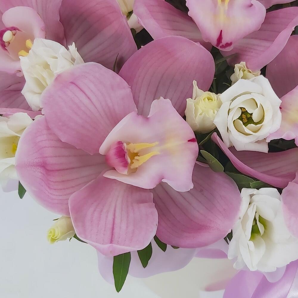 Элегантная композиция из орхидей и маттиолы в коробке. Такой презент всегда уместен и подойдёт для любого повода: День Рождения, именины, годовщина свадьбы, рождение ребенка, 8 марта, День Святого Валентина, выпускной и т.д. Можно вручить маме, сестре, подруге, коллеге, учителю, любимой.