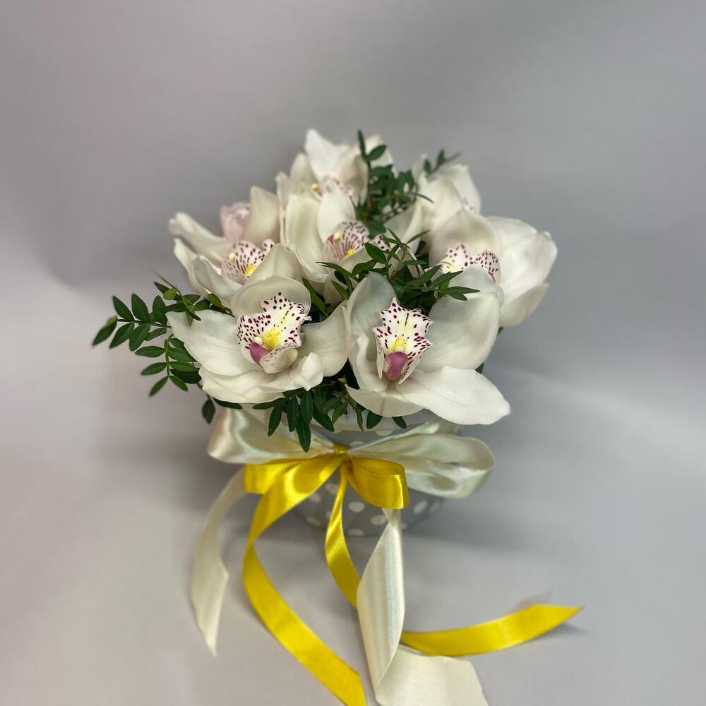 Орхидея Цимбидиум – 9 шт.Фисташка пучок – 1 шт.Коробка шляпная – 1 шт.