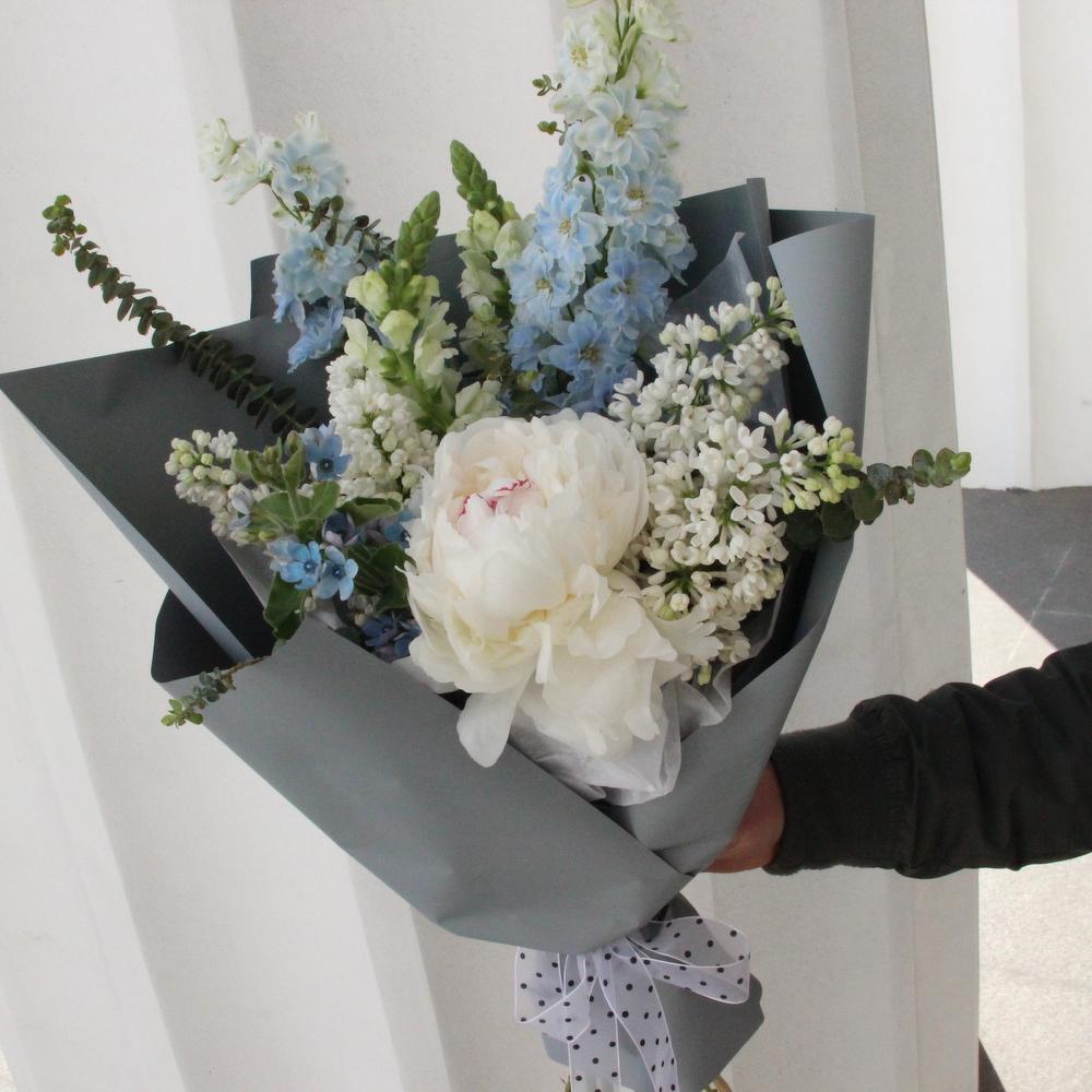 Дельфиниум – 2 шт.Пион – 1 шт.Твидия – 1 шт.Львиный зев – 2 шт.Маттиола – 2 шт.Эвкалипт – 2 шт.Тишью – 1 шт.Упаковка дизайнерская – 3 шт.Лента – 1 шт.