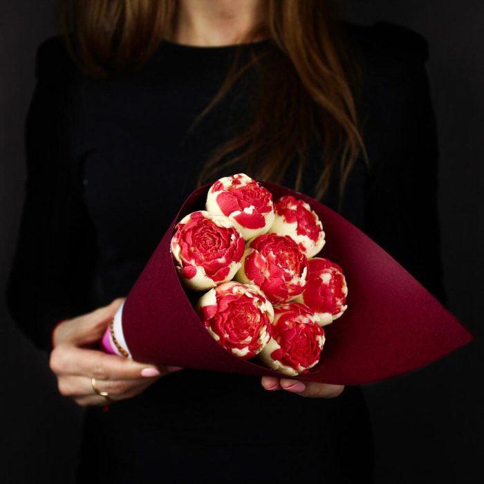 Прозрачная пленка – 1 шт.Дизайнерский картон – 1 шт.шоколадные пионы – 7 шт.