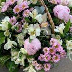 Пион Сара Бернар – 5 шт.Альстромерия – 10 шт.Сантини – 8 шт.Эвкалипт – 3 шт.Зелень – 5 шт.Корзина – 1 шт.