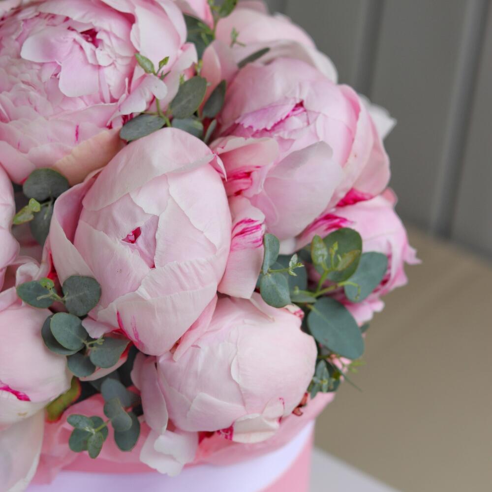 Пион розовый – 13 шт.Эвкалипт – 1 шт.Шляпная коробка – 1 шт.Открыточка с вашими пожеланиями – 1 шт.Шоколадка – 1 шт.