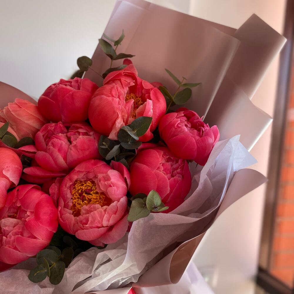 Яркие пионы коралл- шарм , в стильной упаковке от наших флористов ❤️