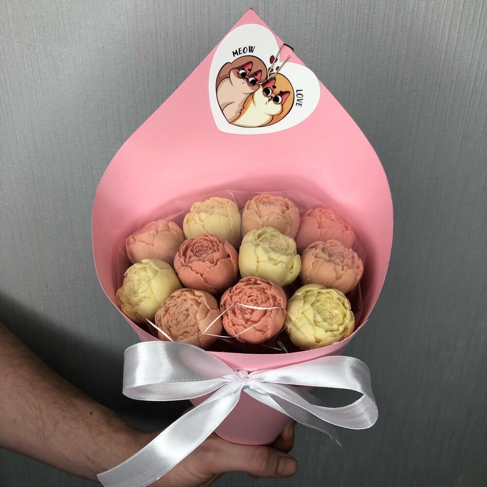 Мини открытка – 1 шт.шоколадные пионы из бельгийского шоколада – 11 шт.