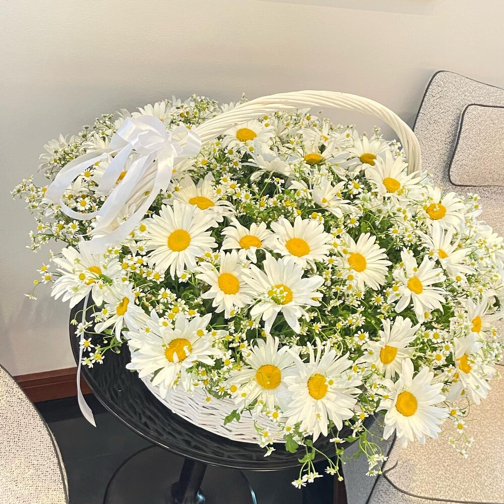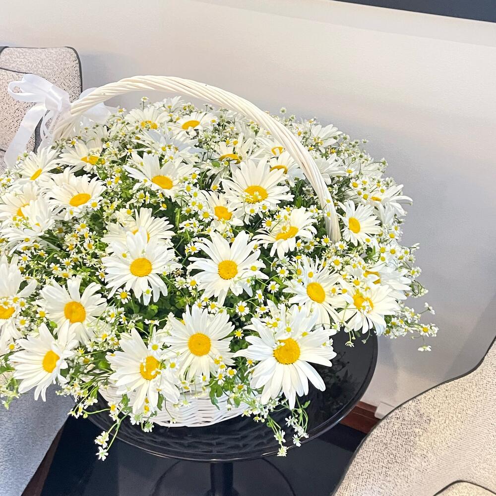 Ромашка одноголовая – 51 шт.Ромашка кустовая – 100 шт.Корзина плетеная – 1 шт.Лента атласная – 2 шт.Кризал – 1 шт.Открыточка с вашими пожеланиями – 1 шт.инструкция по уходу за цветами – 1 шт.хорошее настроение – 100 шт.