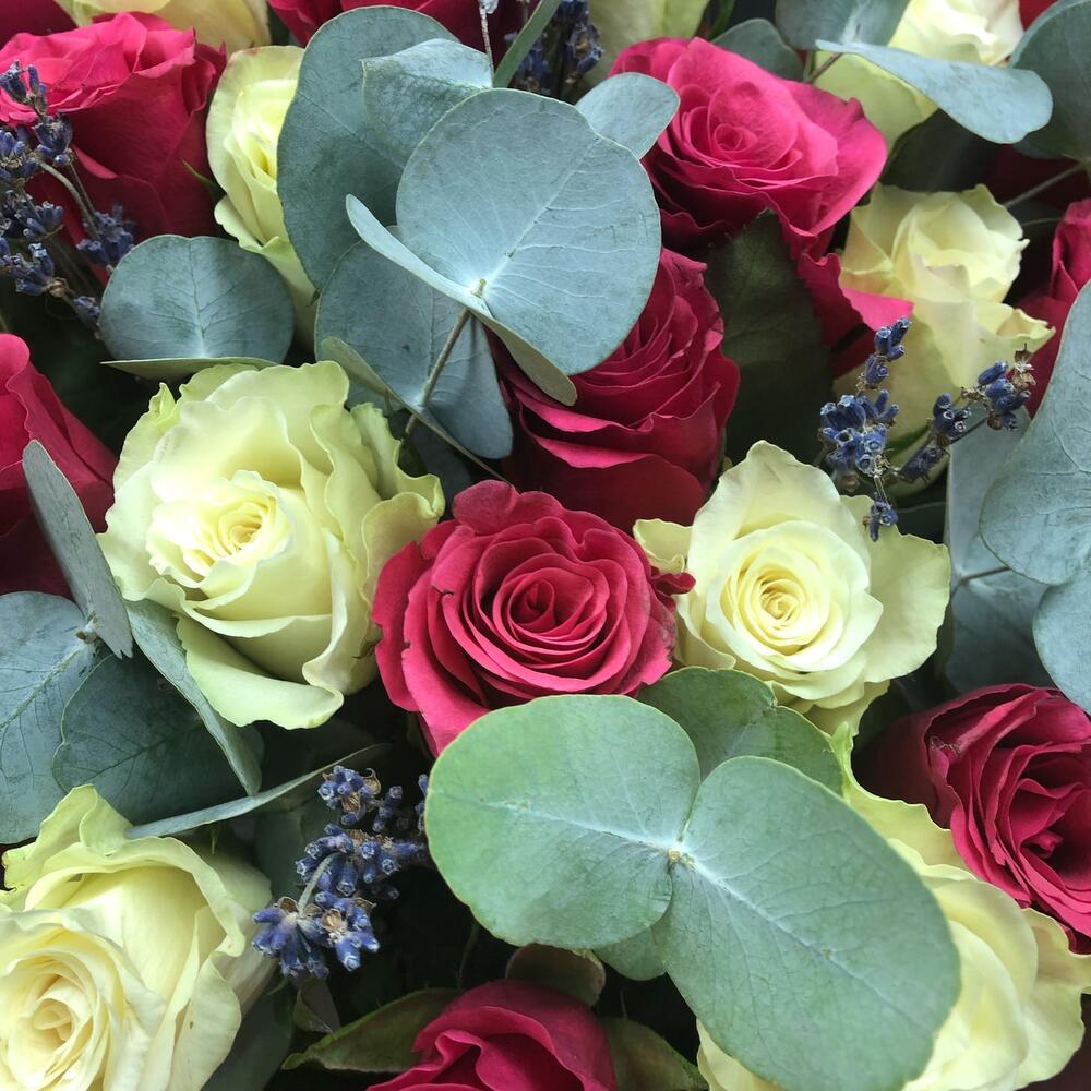Лаванда (сухоцвет) – 5 шт.Эвкалипт – 3 шт.Роза Кенийская – 19 шт.Упаковка дизайнерская – 2 шт.