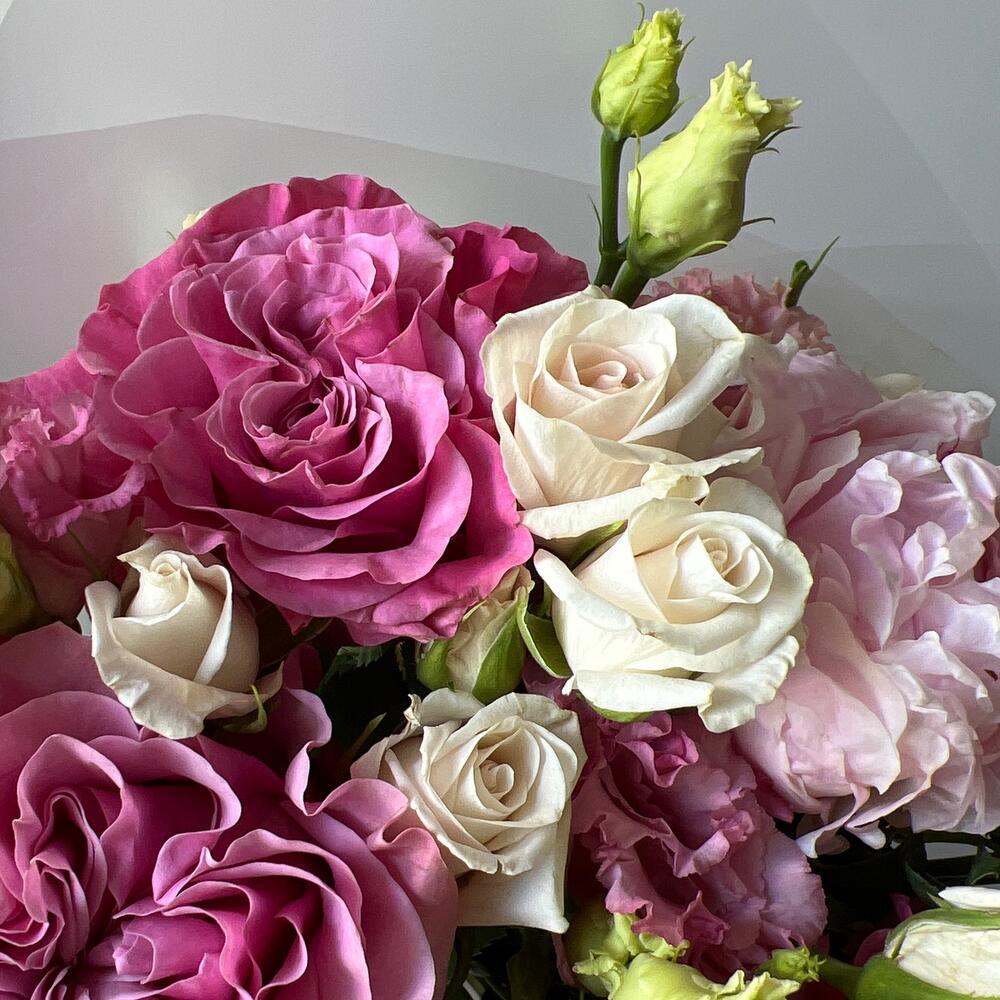 Пион Сара Бернар – 3 шт.Роза пионовидная – 3 шт.Лизиантус алиса – 2 шт.Роза кустовая – 3 шт.Упаковка дизайнерская – 1 шт.