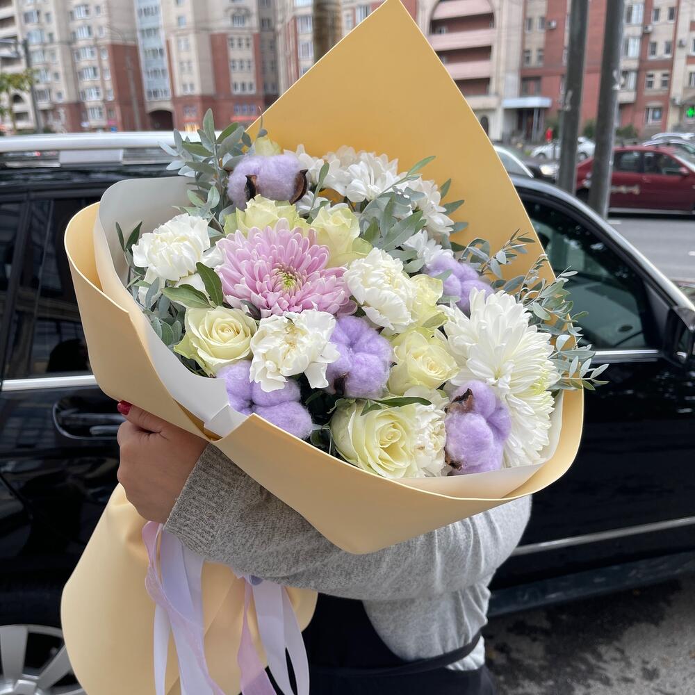 Хризантема кустовая – 1 шт.Хризантема – 1 шт.Гвоздика – 4 шт.Лента атласная – 2 шт.Пленка матовая – 6 шт.Хлопок натуральный – 5 шт.Роза россия белая – 7 шт.фисташка зелень – 5 шт.россана – 1 шт.