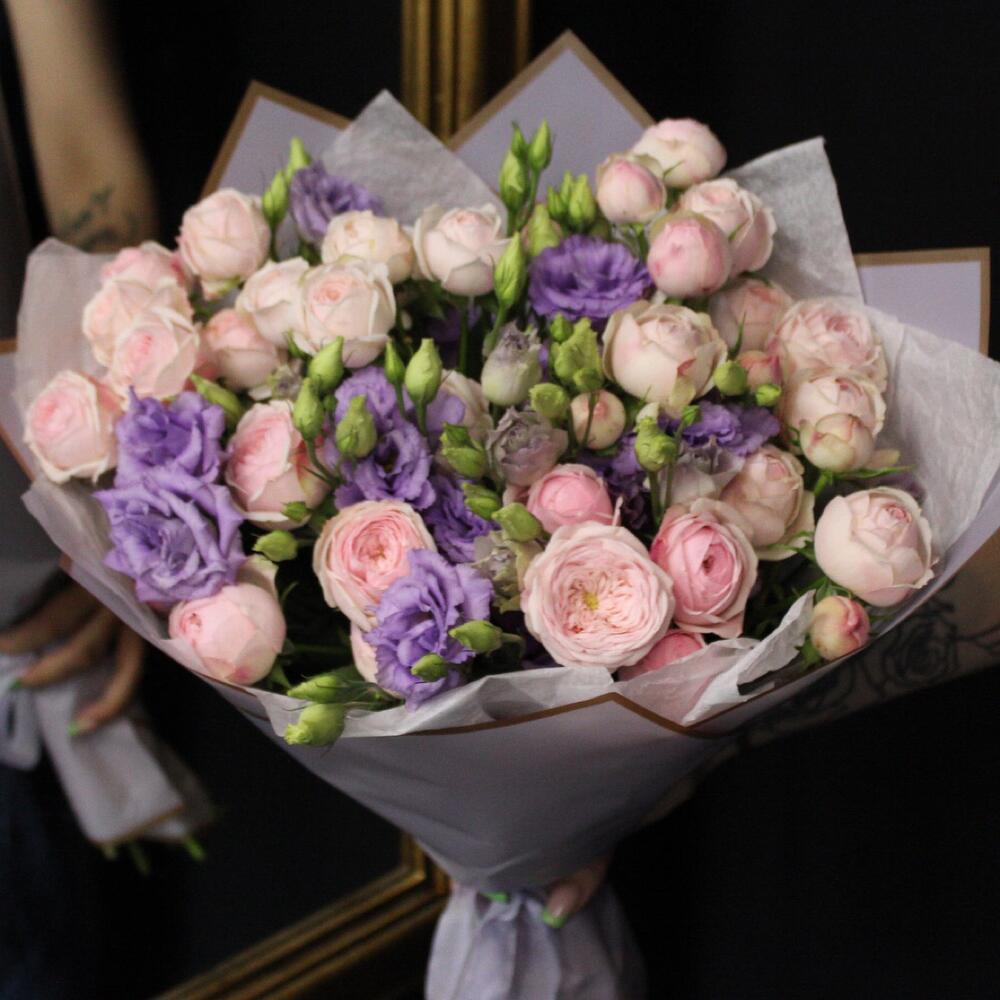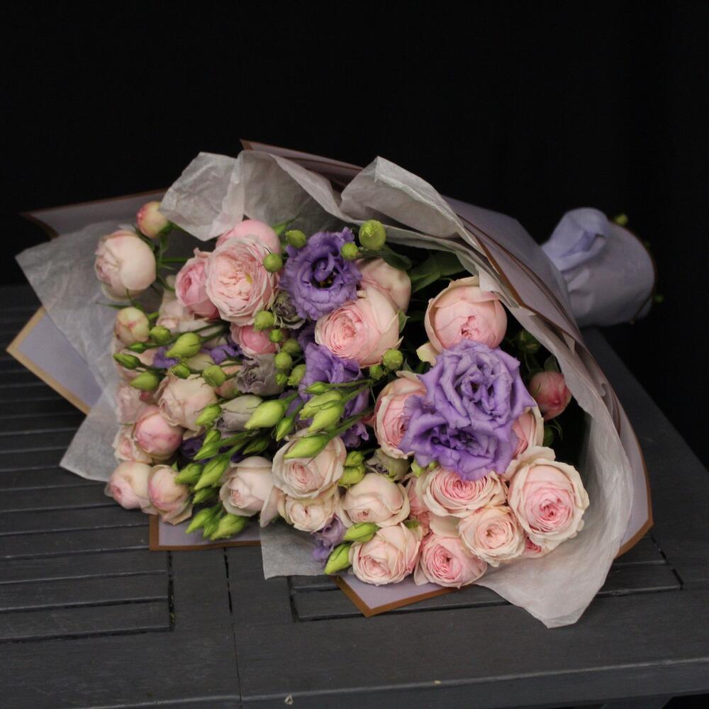 роза пинк менсфилд – 7 шт.эустома лавандовая – 5 шт.Тишью – 2 шт.Пленка матовая – 3 шт.Лента атласная – 2 шт.