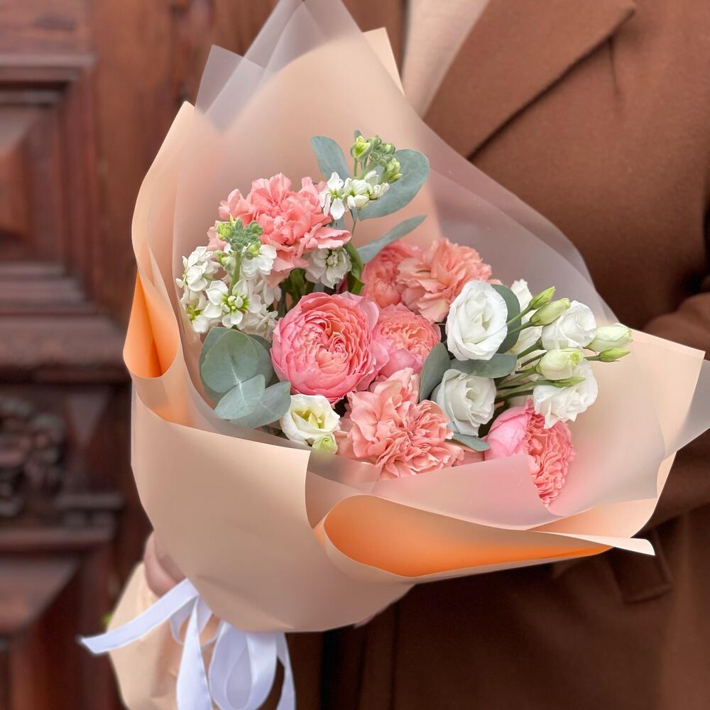 Роза кустовая пионовидная джульетта – 1 шт.Диантус – 5 шт.Маттиола – 2 шт.Эвкалипт – 1 шт.эустома розита вайт – 1 шт.Пленка матовая – 5 шт.Лента атласная – 2 шт.