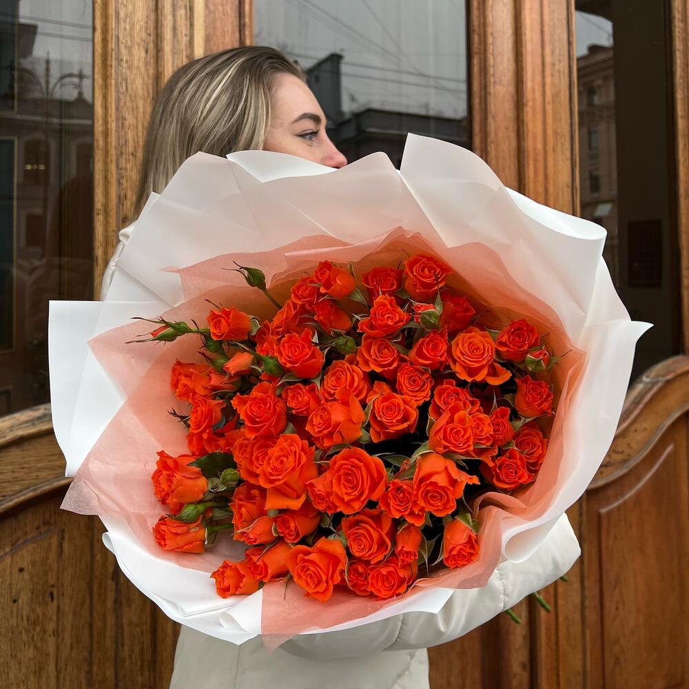 Роза оранжевая 60 см – 15 шт.Дизайнерская упаковка – 5 шт.Тишью – 2 шт.Лента атласная – 2 шт.