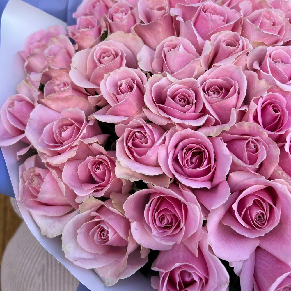 Роза розовая 60 см – 45 шт.Тишью – 1 шт.Дизайнерская упаковка – 3 шт.Лента атласная – 2 шт.