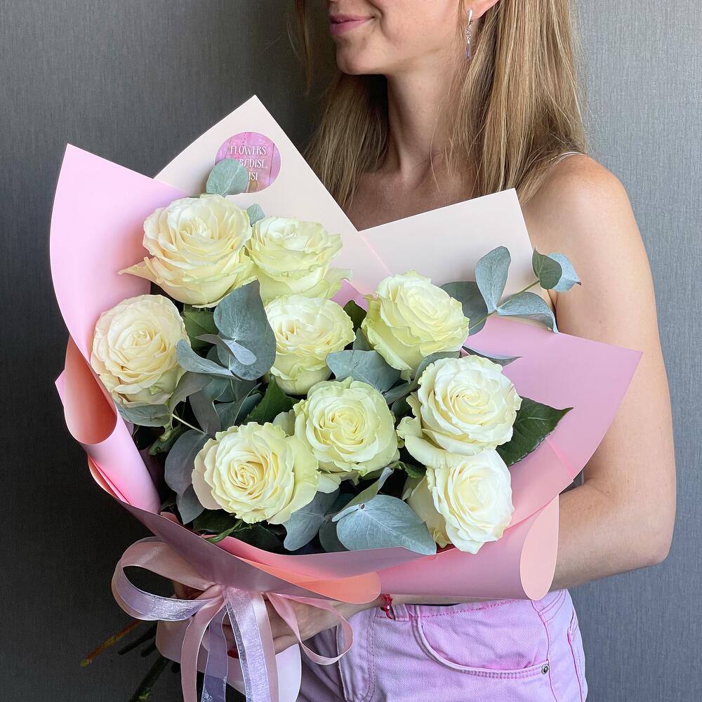 роза (голандия) – 9 шт. Эвкалипт – 2 шт. Упаковка – 1 шт. Атласная лента – 1 шт.